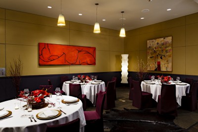 the alder room has a contemporary style and dramatic artwork by pacific northwest artists. parties have views into the main dining room, but the door and drapery may be closed for complete privacy.